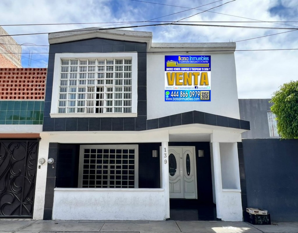 ¡¡¡ OFERTA BAJO EL PRECIO DE $2,550,000 a solo….. $ 2,47000,000 PRECIO A TRATAR !!!EXCELENTE CASA , ESTA UBICADA EN UNA DE LAS MEJORES ZONAS DE SAN LUIS POTOSI, IDEAL PARA SU FAMILIA, FRENTE A ESCUELA DE BACHILLERATO CERCA DEPORTIVOS,UNIVERSIDADES,ESCUELAS,IGLESIAS, CENTROS COMERCIALES, VIAS DE ACCESO RAPIDAS : LA CASA CUENTA CON 2 NIVELES 3 Recámaras, Cocina integral amplia con estufa modelo isla, Sala, Comedor, Recámara principal amplia y excelentes acabados, cuarto de TV, área de lavado, 1.5 baño Se aceptan y se tramitan Créditos Bancarios, Informes y Citas www,barsainmuebles.com ó al Cel. 4448 66 09 79 con WhatsApp y Telegram